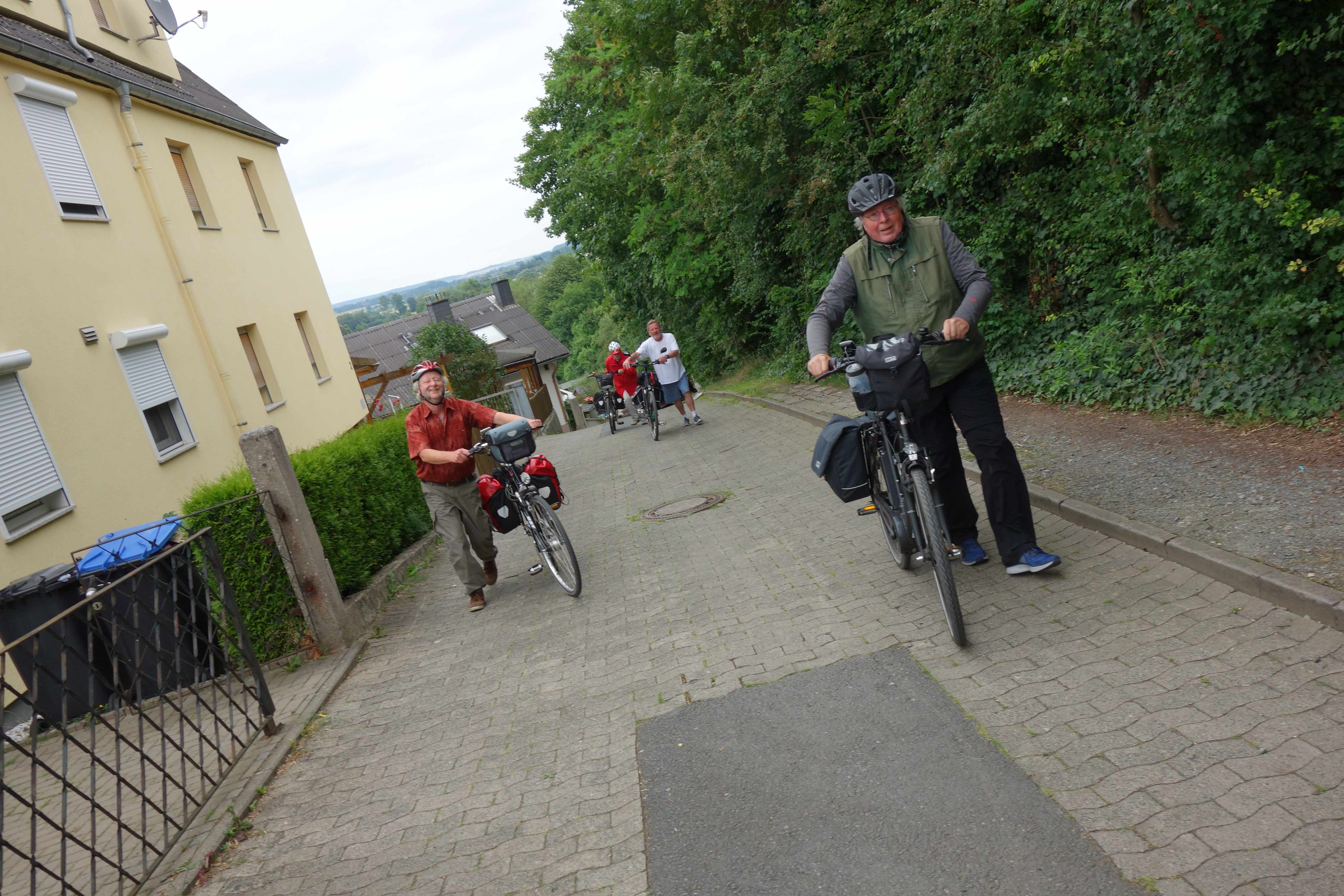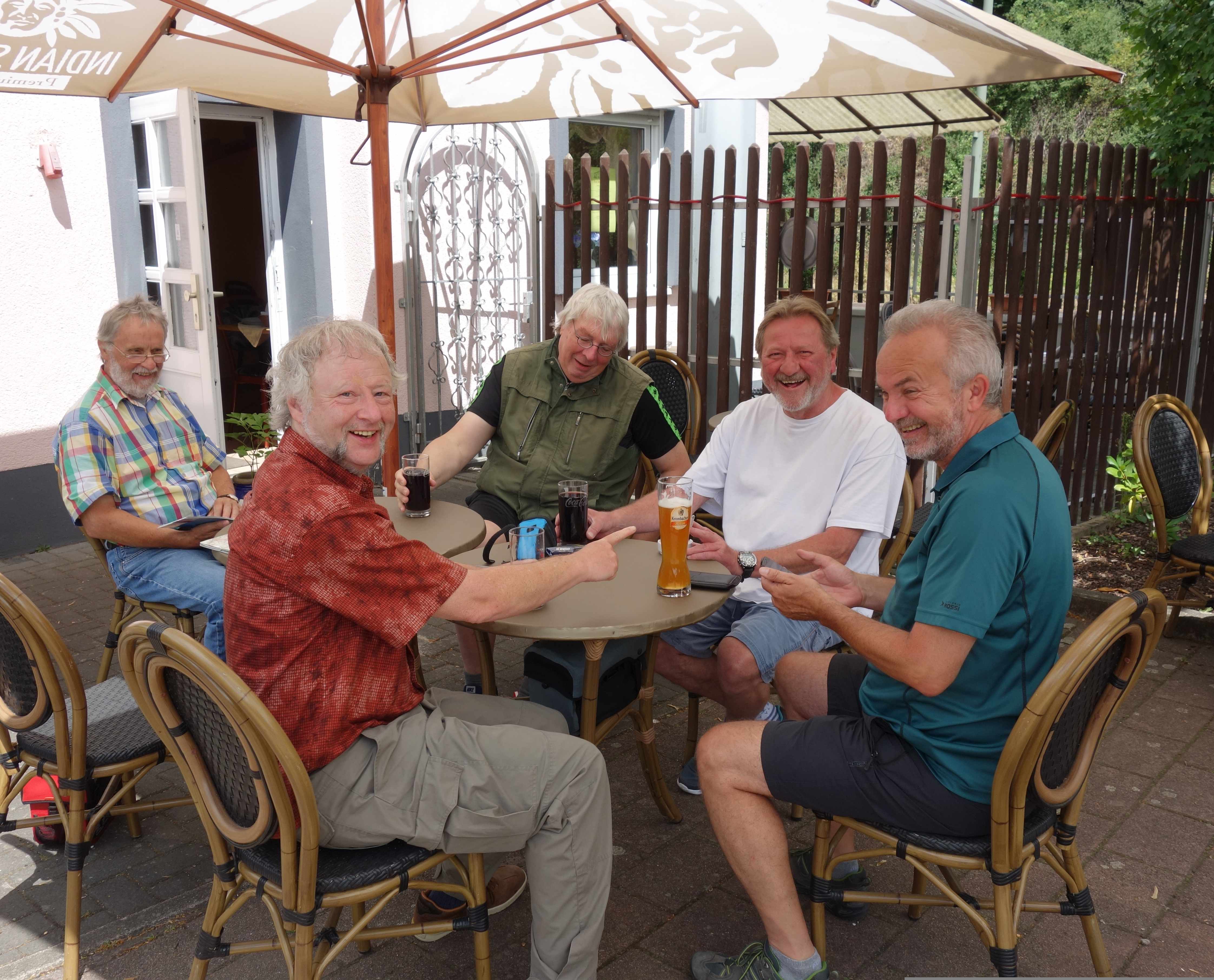 Zu den einzelnen Tagen möchte ich nicht viel schreiben, da die Bilder einen guten Überrblick über Wetter und Laune gab. Nur soviel: im Gegensatz zu den anderen Reisen gab es hier einen Männerüberschuss. So war Heike die einzige Alibi-Frau auf diesem Trip. Weiterhin haben wir gelernt, dass Männer nicht gut lesen können (wie auch beim Aufbau von Ikea-Möbeln. Während Peter mit Glück bei der Anreise in Siegen den richtigen Zug fand, nahm der Rest der Gruppe in Siegen den falschen Zug und landete nicht beim geplanten Treffpunkt in Bad Laasphe, sondern in Herborn. Von hier ging es dann mit großen Umwegen nach Bad Laasphe, so dass wir den geplanten Zusammenschluss in Bad Laasphe erst mit großer Verspätung vollziehen konnten. Aber ab da ging es dann wir geplant weiter.
