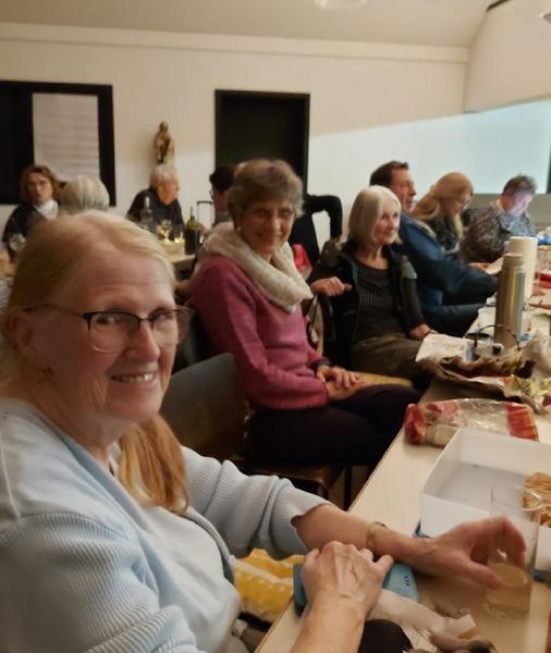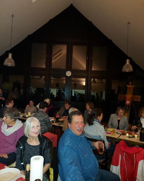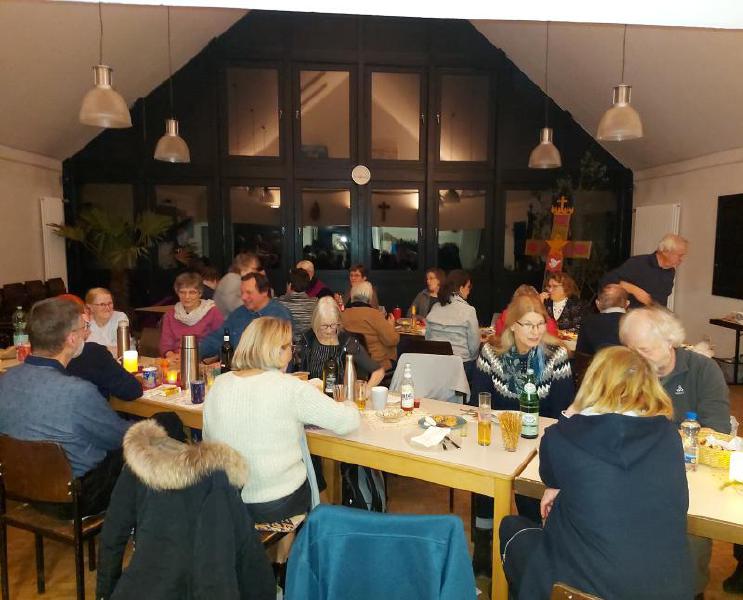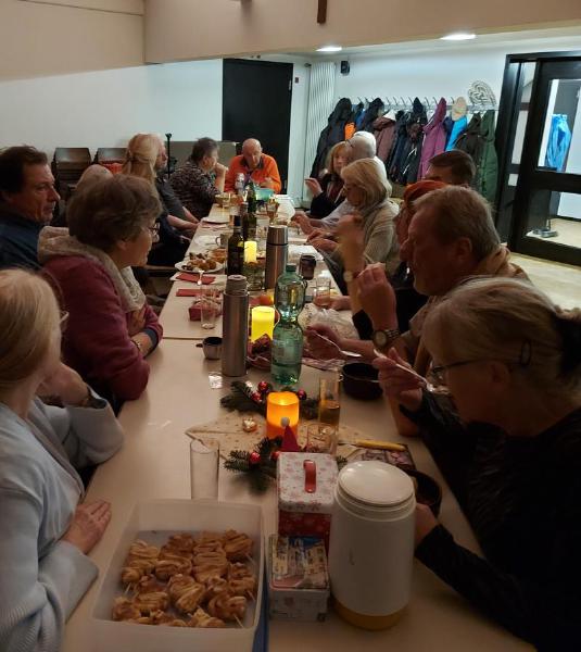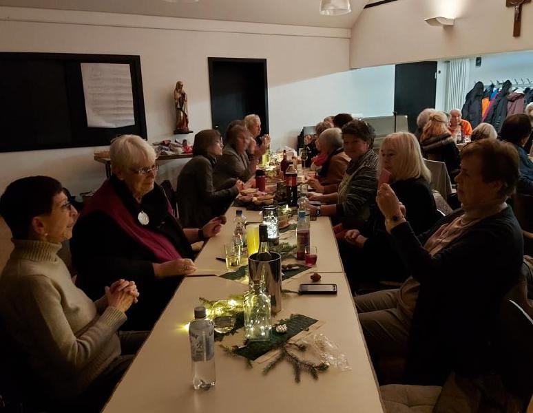 Mit Tannengrün, Lichterketten, Schalen mit Gebäck und Platten mit Herzhaftem verwandelte sich der Pfarrsaal in kürzester Zeit und es wurde richtig gemütlich. So stellte sich schnell eine schöne Adventsstimmung ein. So manch gutes Gespräch wurde geführt und alle waren froh, mal wieder zwanglos zusammen zu sitzen.