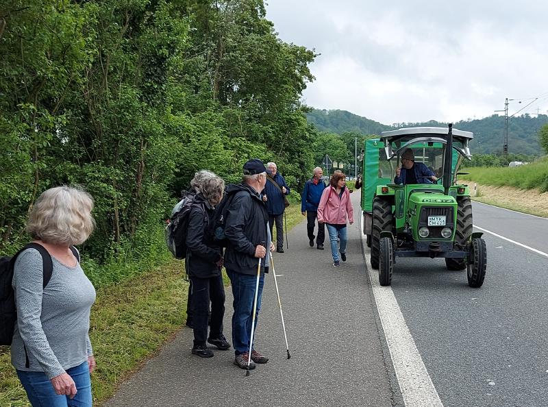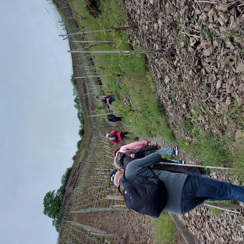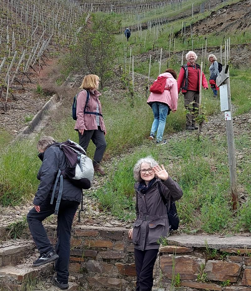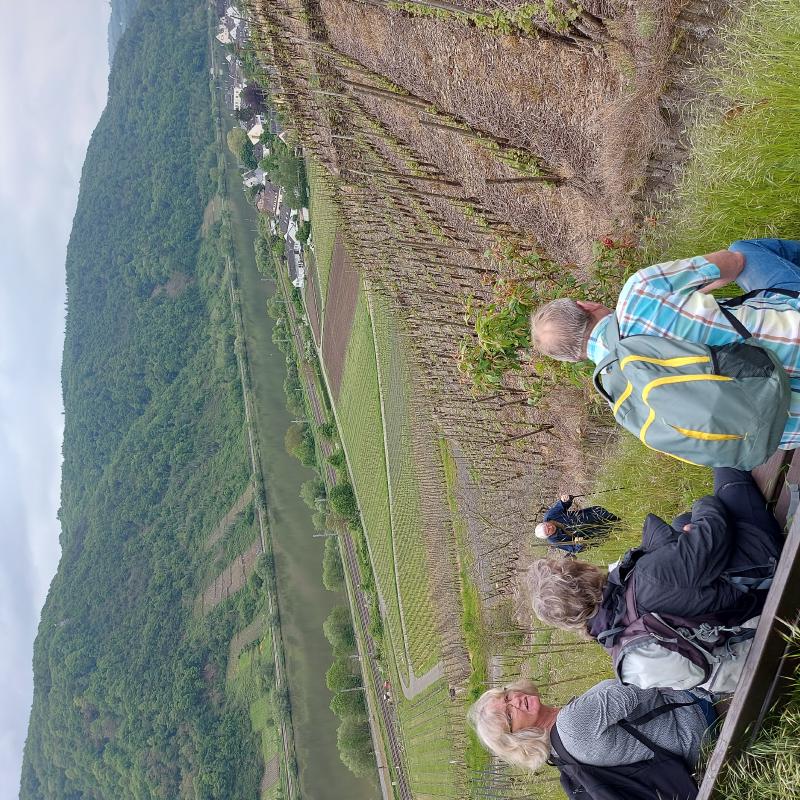 Für den Donnerstag hatten sich drei Gruppen gebildet: Gruppe 1 stieg um 11:00 Uhr in den Planwagen, aus erst 8 Leuten wurde wegen der Wetterpanik eine Gruppe von 11 "Fußkranken" und Menschen, die an einer trockenen Kehle litten. Diese Gruppe muss wohl viel Spaß gehabt haben, die "Fußgesunden" winkte ihnen fröhlich hinterher. Die zweite Gruppe wollte nur "eben" ein wenig Spazierengehen und machte sich auf Richtung Winningen. Die "Wandergruppe" hatte vor den Moselkamm zu erklimmen und machte sich in Fußballmannschaft-Stärke auf den "Berg" zu erklimmen. Und es war trocken, die Sonne kam hin und wieder hervor, es war eine Freude durch die Weinberge zu schlendern. Dann ging es ein "wenig" steiler bergauf, und steiler und steiler. Und so mancher einschließlich des Autors schwächelte. Und dann hatten wir endlich das erste Ziel erreicht. Den Aussichtsplatz "Domgartenhütte" unterhalb des Flugplatzes. Hier konnten wir dann ein wenig rasten und hatten mit dem herrlichen Ausblick ein fantastisches Picknick. Jeder hatte etwas mitgebracht. Es gab Obst in fester und flüssiger Form, Kuchen, Brot, Käse und so weiter. Und das Wetter spielte immer noch mit. Weather-Man hatte noch einmal geliefert. Wir gingen dann nach 60 min weiter Richtung Mosel-Autobahnbrücke, hier ging es dann eben auf dem Kamm weiter. Wir hatten hier einen herrlichen Ausblick durch Felder und Wälder, bis wir schließlich bei der Autobahnbrücke wieder in die Weinberge eintauchten. Es ging flugs bergab und schnell waren wir dann gegen 14:30 Uhr im Dorf, wo wir die "weinselige" Planwagengruppe wiedertrafen, und überraschenderweise auch die Spaziergänger. Die waren auch auf dem Kamm gewesen, hatten nur den bequemen Weg genommen.