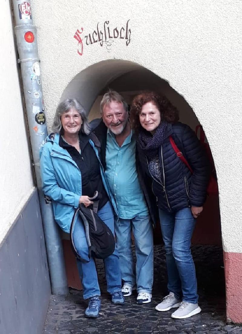 Aber die Enttäuschung wurde durch den Wetterbericht vorprogrammiert. Es sollte regnen, regnen und kühl sein. Waren also alle Ausflüge in Gefahr? Nein, dass durfte nicht sein, und so haben wir nach guter, alter Manier Weather-Man um Hilfe angerufen. Auf jeden Fall half Weather-Man schon einmal am Anreisetag. Morgens im Westerwald: es regnete, teilweise so, dass die Autobahn wegzuschwimmen drohte. Doch dann, Richtung Rhein wurde es trockener und im Moseltal war es dann trocken. Weather-Man hatte erst einmal geliefert. Es ging dann zu einem ersten gemeinsamen Erkundungsspaziergang ins Dorf mit einem leckeren Mittagessen. Und rein zufällig traf man sich nach und nach, auch ohne verabredet zu sein.