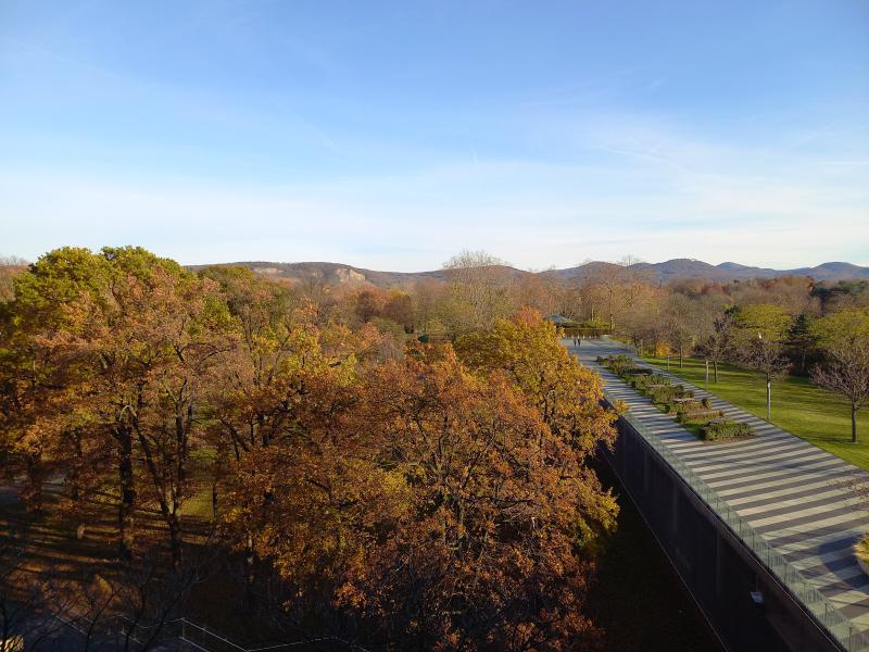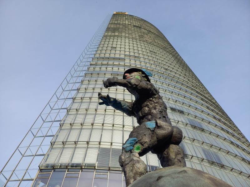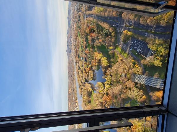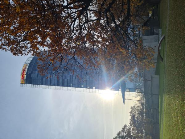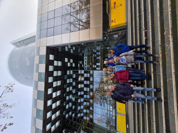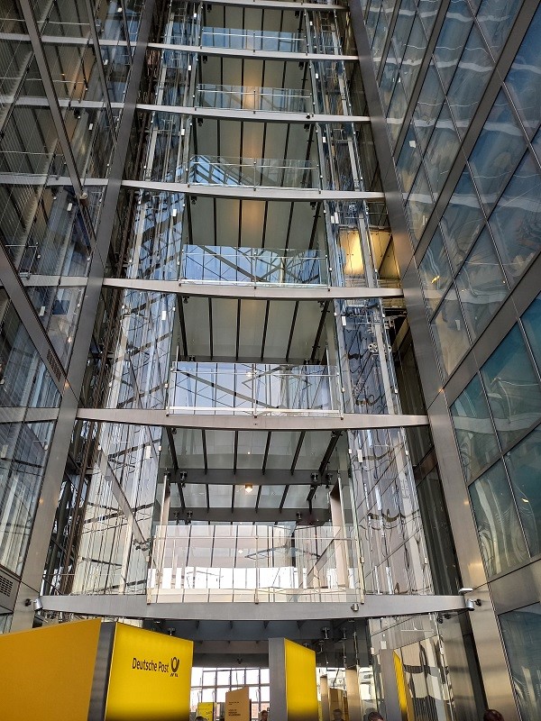 Nachdem wir alle unsere Ausweise vorgezeigt hatten, bekamen wir Besucherausweise und wurden von unserer Führerin begrüßt. Dann ging es zunächst auf einen Außenbalkon im zweiten Stock, der aber noch außerhalb des eigentlichen Towers liegt. Hier weihte uns die nette und sehr lebhafte Führerin in viele Eigenarten des imposanten Gebäudes ein. Wir erfuhren viel über Architektur, Grundriss, Klima, Lüftung und Eigenart der Büros und auch, dass hier 2000 Menschen arbeiten.