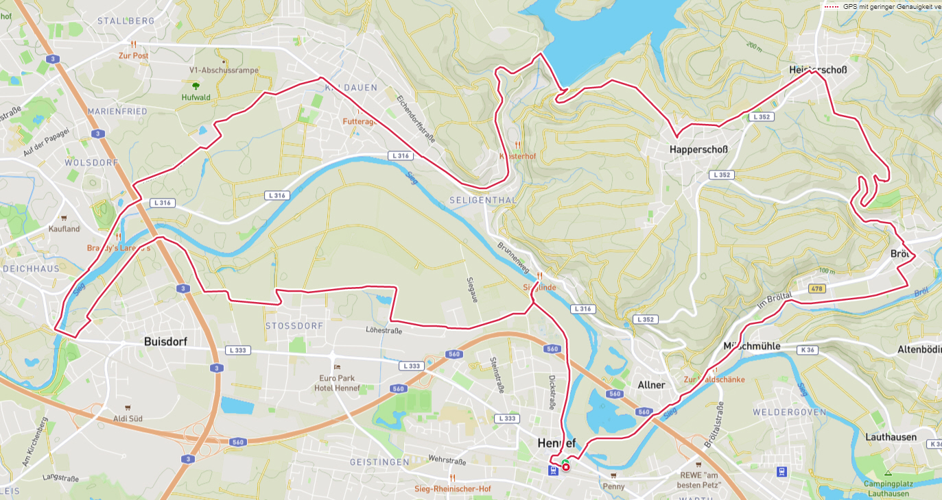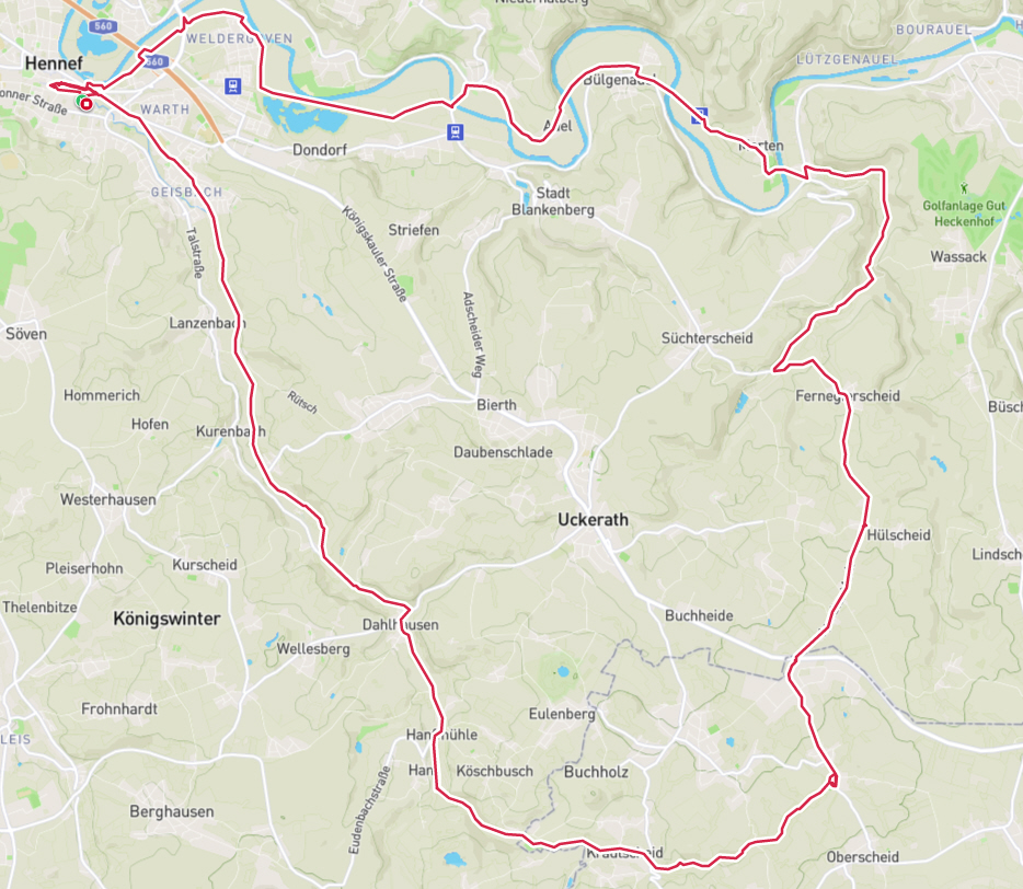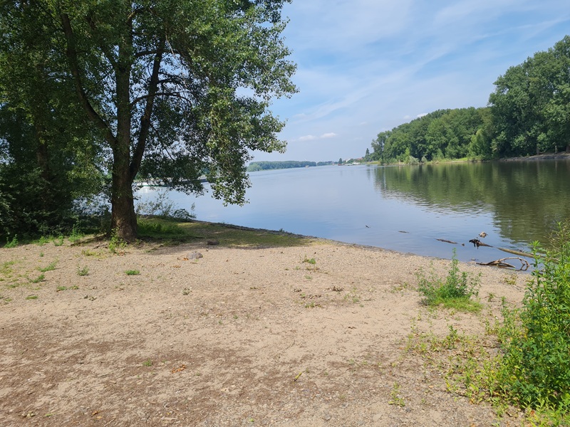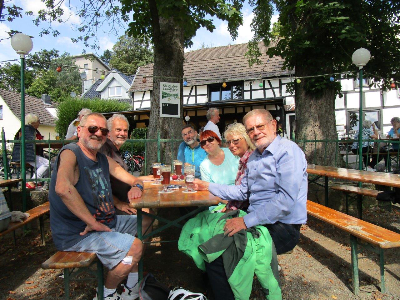 Das Wetter hätte schöner nicht sein können, frisch und sonnig. Unterwegs gestand uns Frauke, dass es ihr sehnlichster Wunsch sei, mal auf der Landzunge zwischen Rhein und Sieg zu stehen. Nun, den Wunsch haben wir ihr gerne erfüllt. Die Landzunge heißt "Kemper Werth" und die 3 Km von der Siegfähre bis zur Landspitze sind fahrtechnisch herausfordernd. Jedenfalls, wenn das Rad nicht gut gefedert ist. Nach diesem Abenteuer gings zurück zur Siegfähre und mit selbiger setzten wir auf die andere Seite der Sieg über, wo uns das Gasthaus mit einem schönen Biergarten empfing. Essen und Trinken waren prima. Und dann gings rechts-siegig über Troisdorf und Siegburg zurück nach Hennef.