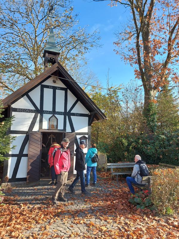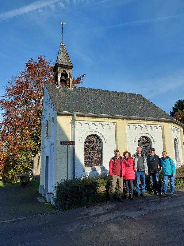 Samstag den 06.November trafen sich sechs Wanderer in Uthweiler. Dies bei aller schönstem Wetter, welches ja so auch bestellt war. Wir haben uns diesmal, und das seit langer Zeit einmal wieder, zu einer Samstagswanderung getroffen. Diesmal haben wir uns die KapellenSchleife 2 vorgenommen. Der Wanderweg führt 13,2 Km lang durch Dörfer und an Kapellen vorbei. Auch den örtlichen Obstanbau konnten wir zumindest (jahreszeitlich bedingt) erahnen. Der Weg führte uns angenehm vom tiefsten Punkt bei 105 Meter üNN auf 213 Meter üNN. Über den schönen Weg und die angeregten Gespräche haben wir Zeit und Mühen total vergessen und waren dann doch erstaunt schon wieder am Ziel der Wanderung zu sein. Schade, dass sich nicht noch einige Wanderer mehr für diese schöne Wanderung begeistern konnten.