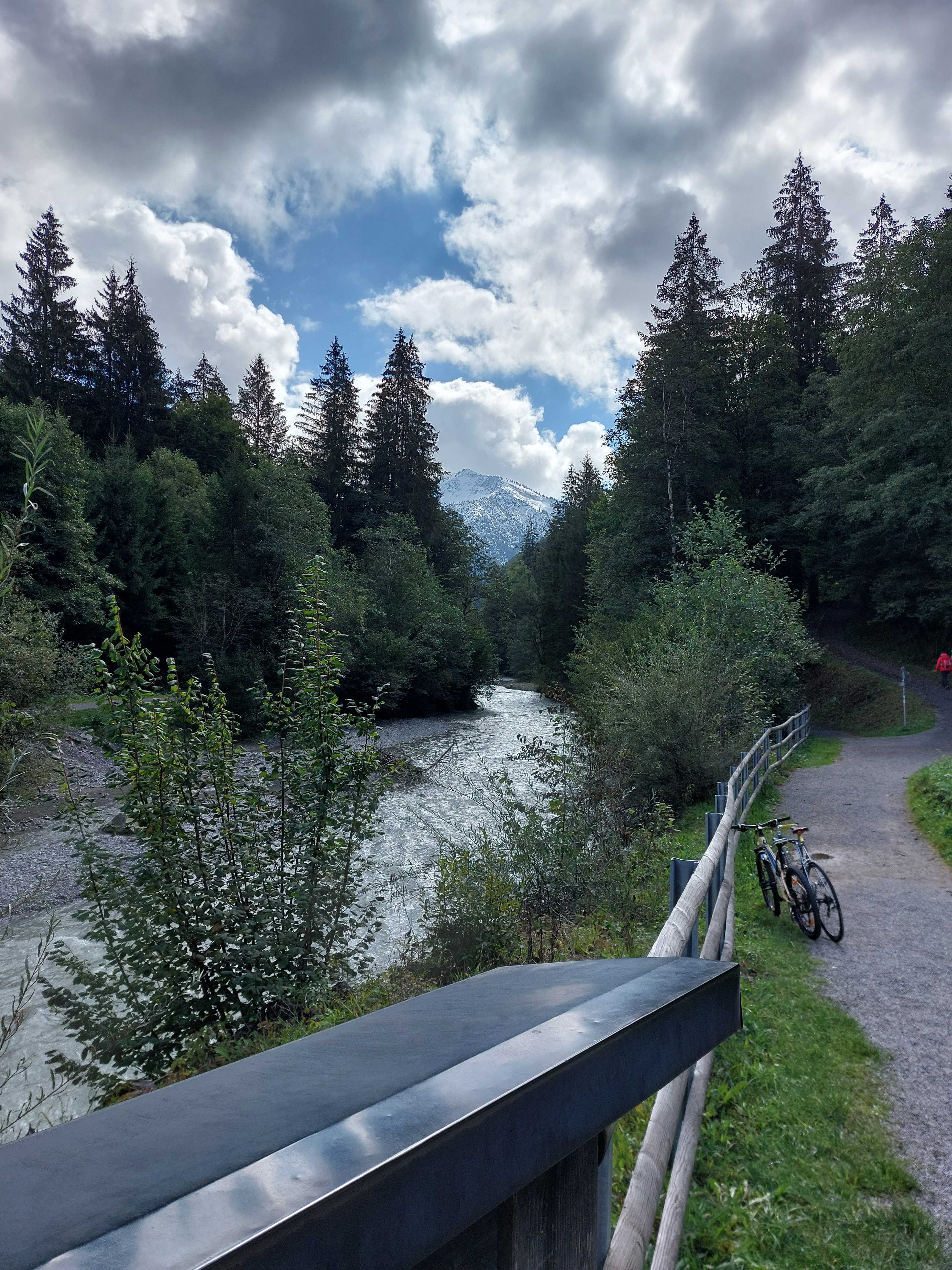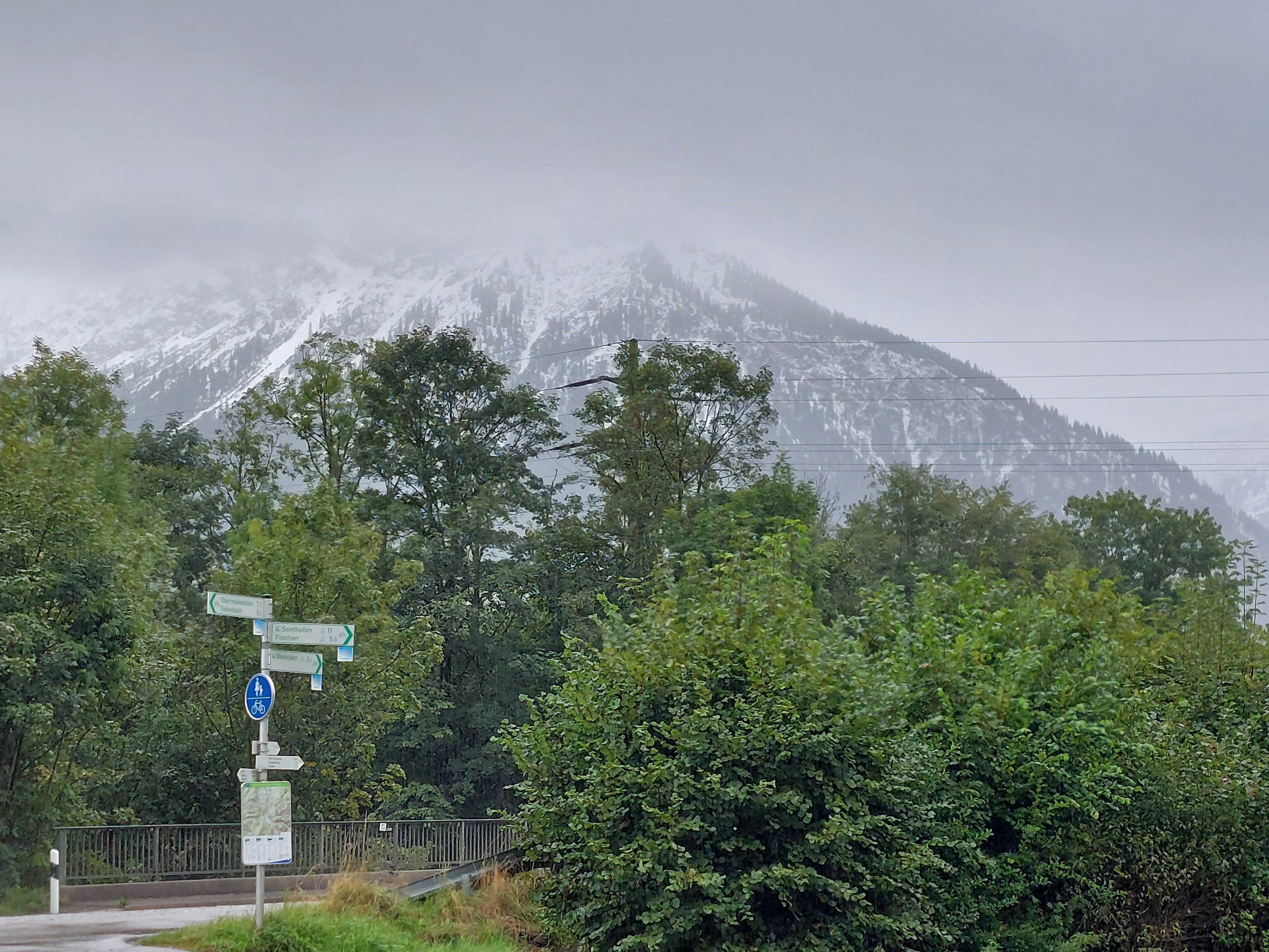 Anfang September, da sollt es doch keine Wetterprobleme geben. Nun, der erste Rad-Tag war ein freundlicher Herbsttag, nicht besonders warm, aber erträglich. Der zweite war ein kühler Herbsttag, mit Temperaturen um 10° Celsius. Da wurde es schon anstrengender. Und der dritte Tag war ein freundlich Wintereinbruch, Temperaturen um 0° Celsius, Regen und Schneeregen und Oberstdorf war mit dem Zug nicht erreichbar. So führten die letzten 20 km mit dem Rad an der Iller entlang begleitet von Schnee und Kälte.