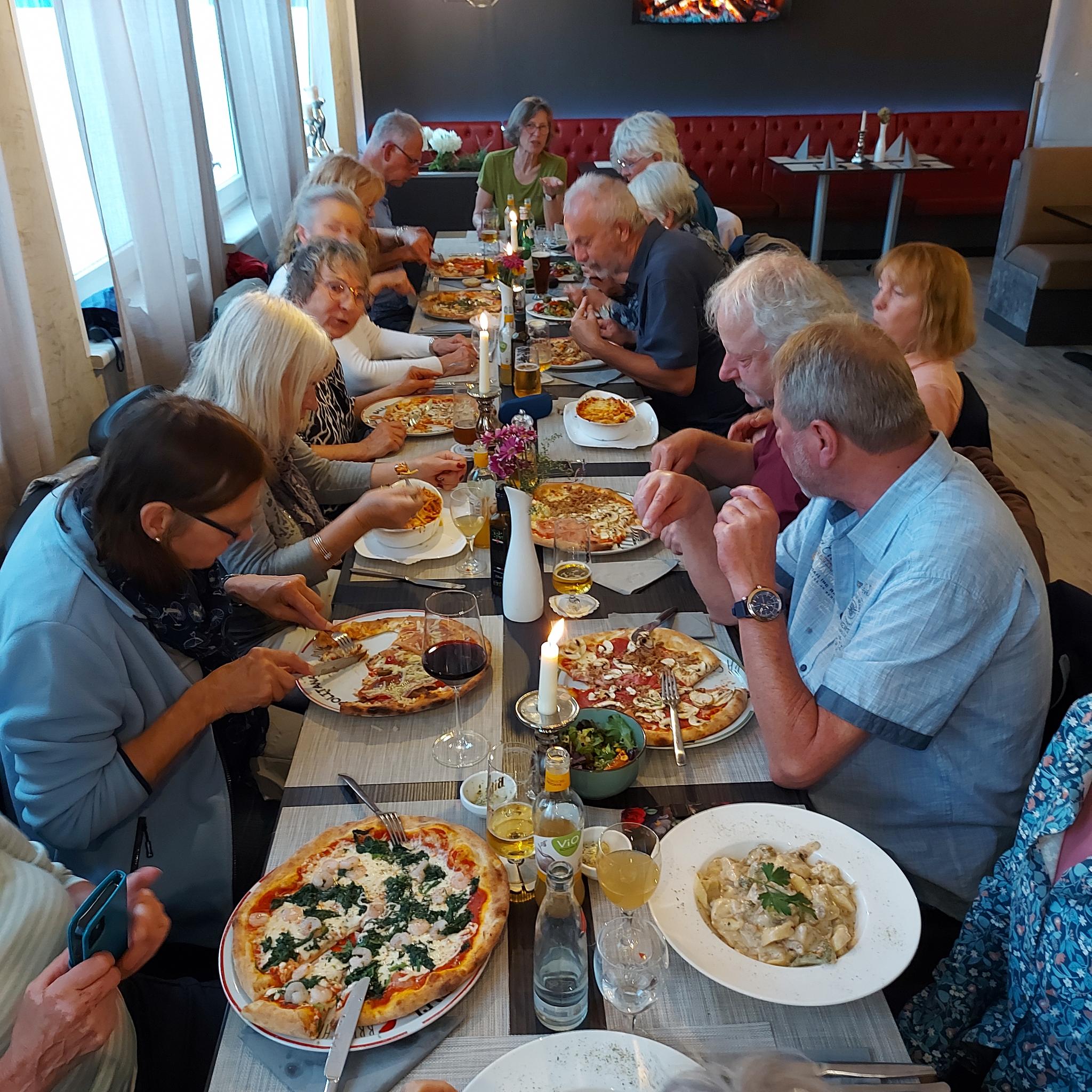 Das Wetter war anfangs sehr schön, am ersten Tag unternahmen wir direkt einen schönen Spaziergang zu den nahegelegenen Seen. Der Weg war eben und sehr schön. Abends hatten wir dann einen Tisch im Balkanstübchen reserviert, so dachten wir jedenfalls! Als wir abends dort eintrudelten, war die Chefin sehr überrascht, sie hatte eigentlich noch auf eine Bestätigung gewartet. Aber mit einigem Organisationstalent bekamen wir das hin: Gabi übernahm die Regie und organisierte den Service und die Chefin sorgte sich um die Küche. So bekamen alle ein leckeres Essen, und die Getränke waren auch lecker.