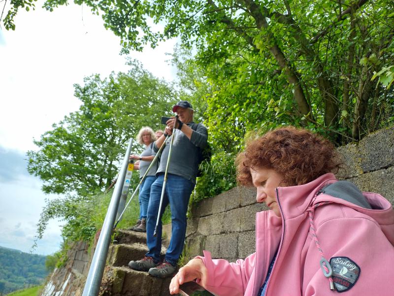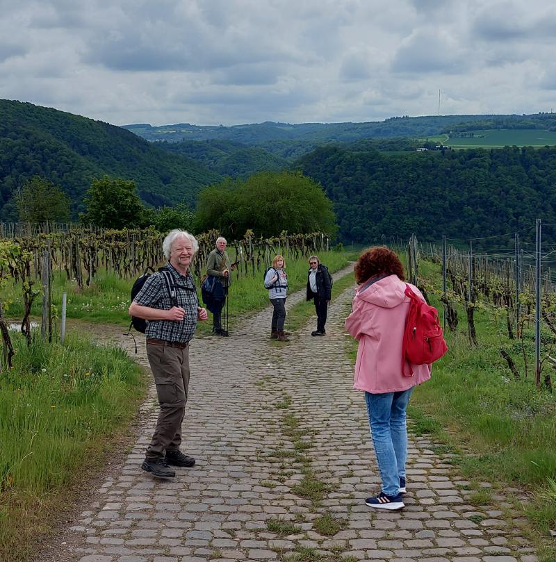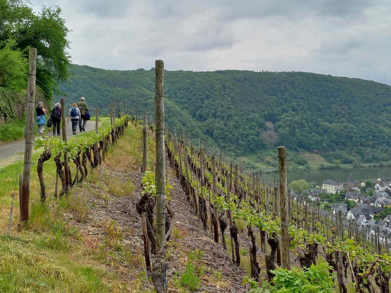 Für den Donnerstag hatten sich drei Gruppen gebildet: Gruppe 1 stieg um 11:00 Uhr in den Planwagen, aus erst 8 Leuten wurde wegen der Wetterpanik eine Gruppe von 11 "Fußkranken" und Menschen, die an einer trockenen Kehle litten. Diese Gruppe muss wohl viel Spaß gehabt haben, die "Fußgesunden" winkte ihnen fröhlich hinterher. Die zweite Gruppe wollte nur "eben" ein wenig Spazierengehen und machte sich auf Richtung Winningen. Die "Wandergruppe" hatte vor den Moselkamm zu erklimmen und machte sich in Fußballmannschaft-Stärke auf den "Berg" zu erklimmen. Und es war trocken, die Sonne kam hin und wieder hervor, es war eine Freude durch die Weinberge zu schlendern. Dann ging es ein "wenig" steiler bergauf, und steiler und steiler. Und so mancher einschließlich des Autors schwächelte. Und dann hatten wir endlich das erste Ziel erreicht. Den Aussichtsplatz "Domgartenhütte" unterhalb des Flugplatzes. Hier konnten wir dann ein wenig rasten und hatten mit dem herrlichen Ausblick ein fantastisches Picknick. Jeder hatte etwas mitgebracht. Es gab Obst in fester und flüssiger Form, Kuchen, Brot, Käse und so weiter. Und das Wetter spielte immer noch mit. Weather-Man hatte noch einmal geliefert. Wir gingen dann nach 60 min weiter Richtung Mosel-Autobahnbrücke, hier ging es dann eben auf dem Kamm weiter. Wir hatten hier einen herrlichen Ausblick durch Felder und Wälder, bis wir schließlich bei der Autobahnbrücke wieder in die Weinberge eintauchten. Es ging flugs bergab und schnell waren wir dann gegen 14:30 Uhr im Dorf, wo wir die "weinselige" Planwagengruppe wiedertrafen, und überraschenderweise auch die Spaziergänger. Die waren auch auf dem Kamm gewesen, hatten nur den bequemen Weg genommen.
