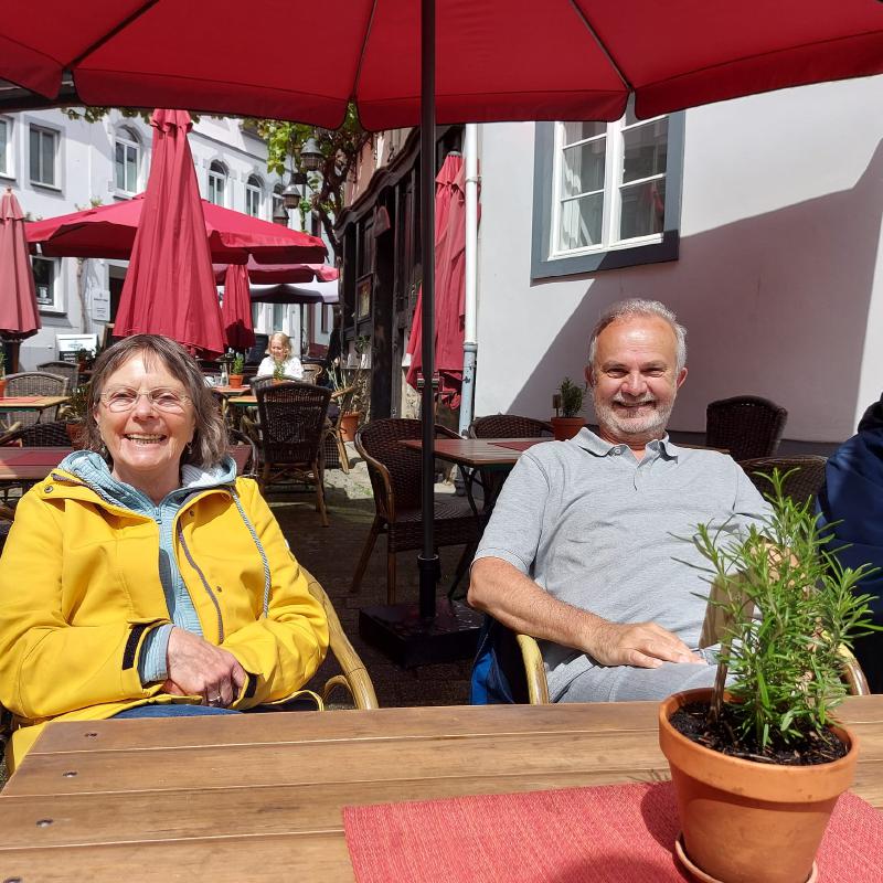 Aber die Enttäuschung wurde durch den Wetterbericht vorprogrammiert. Es sollte regnen, regnen und kühl sein. Waren also alle Ausflüge in Gefahr? Nein, dass durfte nicht sein, und so haben wir nach guter, alter Manier Weather-Man um Hilfe angerufen. Auf jeden Fall half Weather-Man schon einmal am Anreisetag. Morgens im Westerwald: es regnete, teilweise so, dass die Autobahn wegzuschwimmen drohte. Doch dann, Richtung Rhein wurde es trockener und im Moseltal war es dann trocken. Weather-Man hatte erst einmal geliefert. Es ging dann zu einem ersten gemeinsamen Erkundungsspaziergang ins Dorf mit einem leckeren Mittagessen. Und rein zufällig traf man sich nach und nach, auch ohne verabredet zu sein.