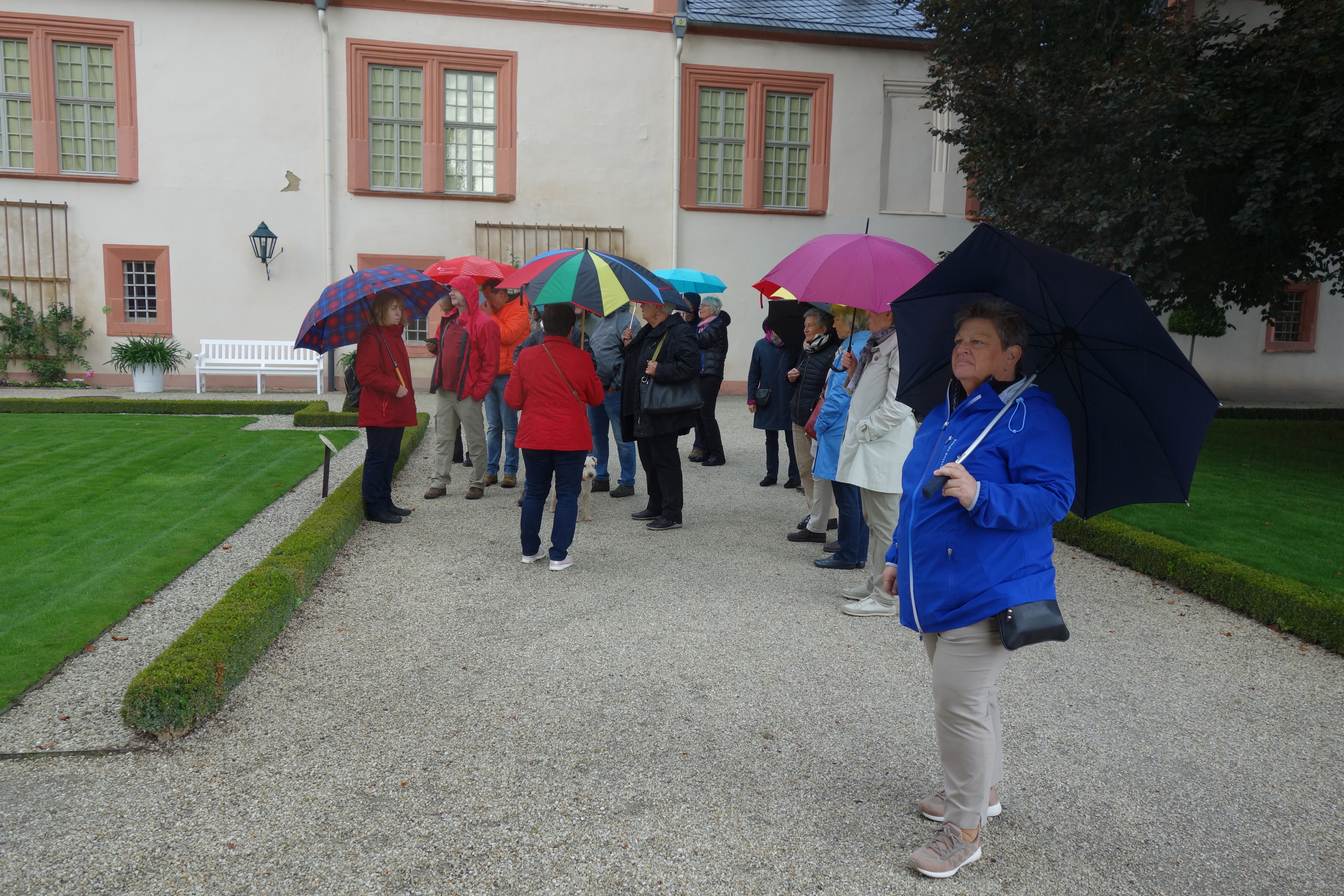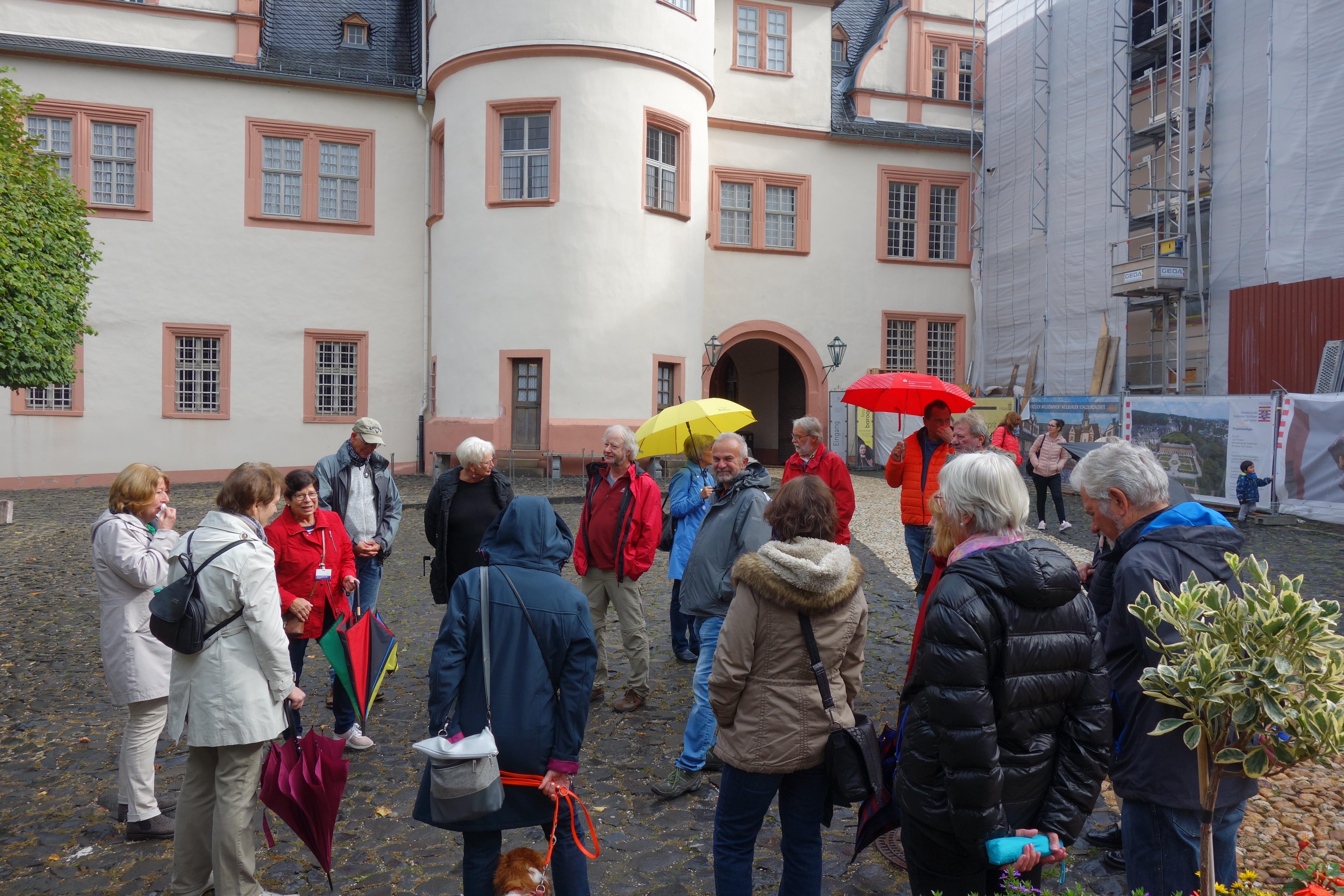 Um 12 Uhr trafen wir uns in der Lobby des Hotels zur Vorbesprechung, denn um 13 Uhr holte uns schon die Stadtführerin, Frau Bartkowski, zu unserer Altstadtführung ab. Sie beschränkte sich auf den alten Kern, den Schlossberg, denn Bewegung hatten wir bei der Übung „Schirm auf – Schirm zu" auch so. Im Rahmen dieser Führung besichtigten wir die sehr interessante, im Stil des Barock erbaute Schlosskirche. Eine erwähnenswerte Besonderheit ist u.a. die unterhalb des Altares befindliche Fürstengruft, abgedeckt durch einen Teppich.