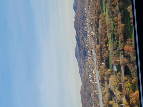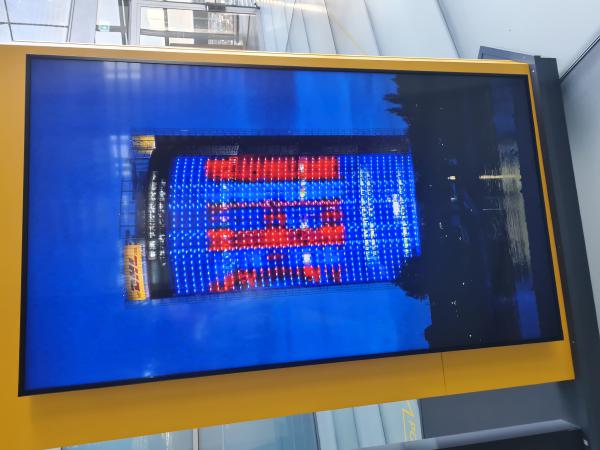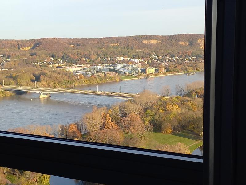 Nachdem wir alle unsere Ausweise vorgezeigt hatten, bekamen wir Besucherausweise und wurden von unserer Führerin begrüßt. Dann ging es zunächst auf einen Außenbalkon im zweiten Stock, der aber noch außerhalb des eigentlichen Towers liegt. Hier weihte uns die nette und sehr lebhafte Führerin in viele Eigenarten des imposanten Gebäudes ein. Wir erfuhren viel über Architektur, Grundriss, Klima, Lüftung und Eigenart der Büros und auch, dass hier 2000 Menschen arbeiten.