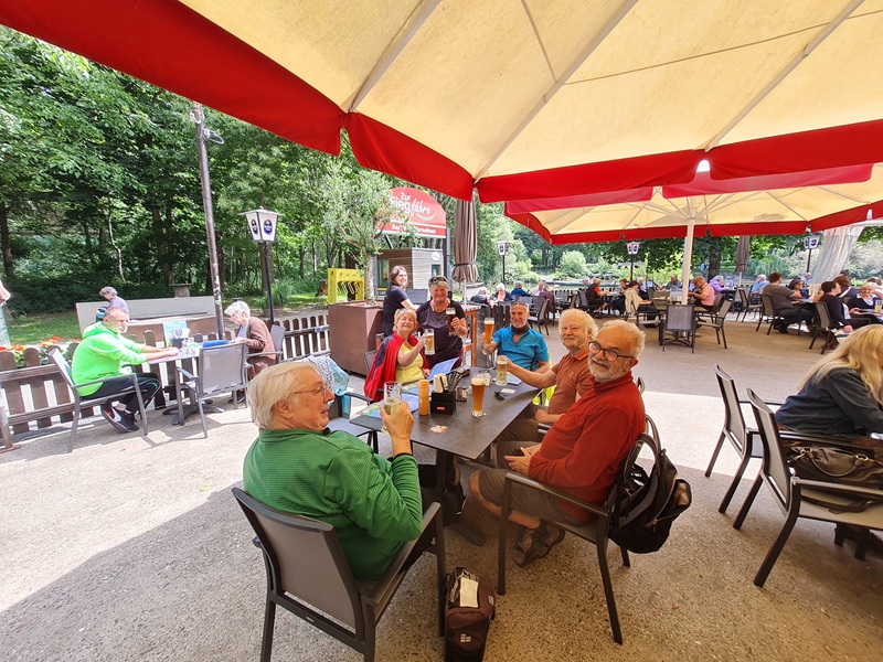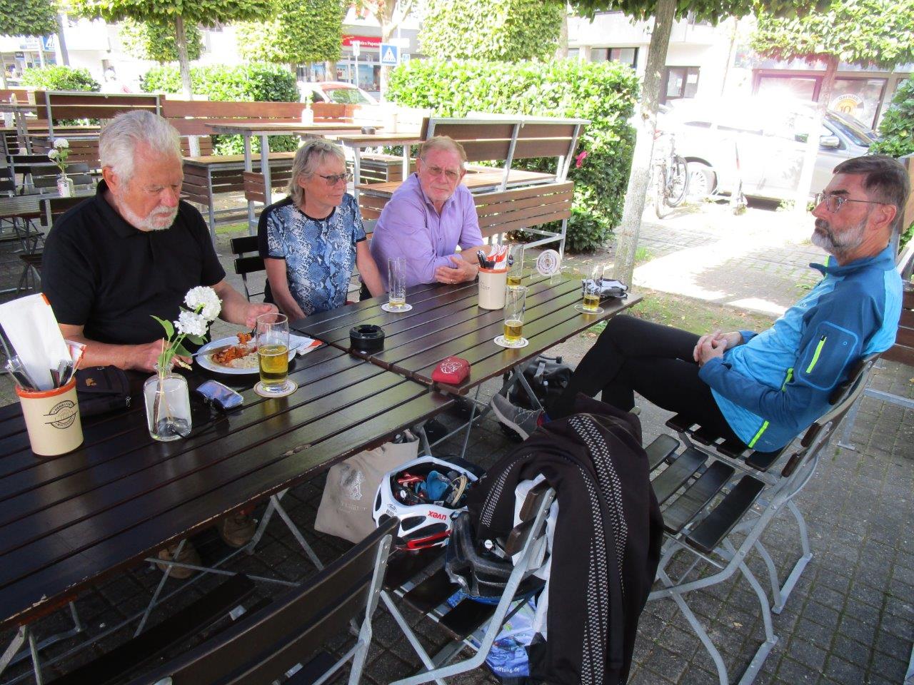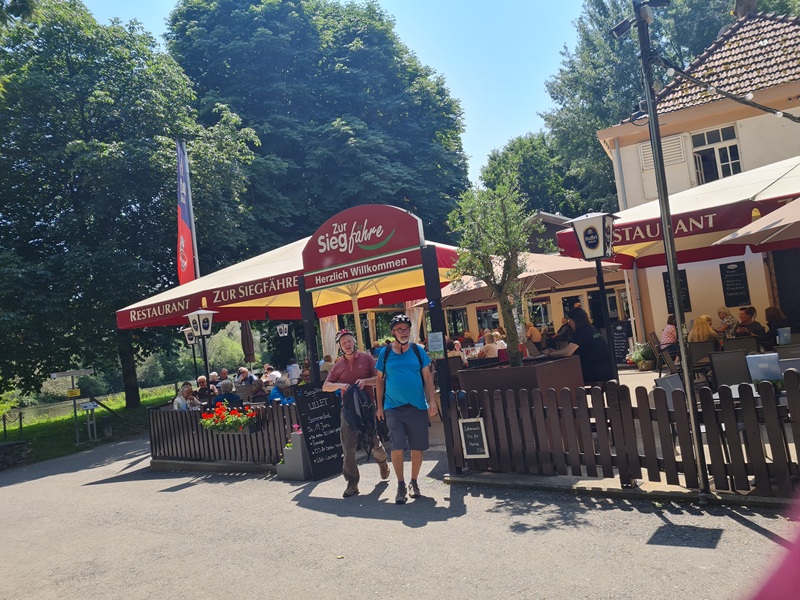 Das Wetter hätte schöner nicht sein können, frisch und sonnig. Unterwegs gestand uns Frauke, dass es ihr sehnlichster Wunsch sei, mal auf der Landzunge zwischen Rhein und Sieg zu stehen. Nun, den Wunsch haben wir ihr gerne erfüllt. Die Landzunge heißt "Kemper Werth" und die 3 Km von der Siegfähre bis zur Landspitze sind fahrtechnisch herausfordernd. Jedenfalls, wenn das Rad nicht gut gefedert ist. Nach diesem Abenteuer gings zurück zur Siegfähre und mit selbiger setzten wir auf die andere Seite der Sieg über, wo uns das Gasthaus mit einem schönen Biergarten empfing. Essen und Trinken waren prima. Und dann gings rechts-siegig über Troisdorf und Siegburg zurück nach Hennef.